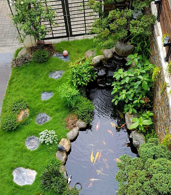 Tiểu cảnh hồ cá Koi mang vẻ đẹp nhiều màu sắc trang trí xung quang là thảm cỏ, những miếng đá để tạo sự hài hòa và giúp gia chủ thuận tiện hơn mỗi khi đi dạo ngắm hồ cá. Hồ với những chú cá Koi nhiều màu sẽ mang lại nhiều tài lộc và sự may mắn cho gia chủ.