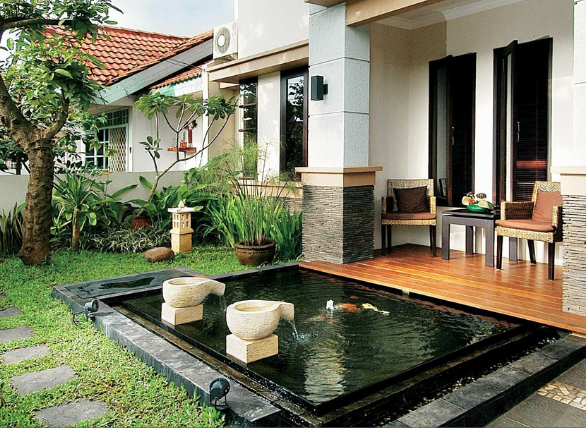 Thiết kế một hồ cá trong vườn kết hợp với các yếu tố như cây xanh, hoa lá sẽ là một điểm điều hòa không khí cho ngôi nhà bạn, hồ cá giúp môi trường trở nên mát mẻ hơn trong thời tiết nóng bức như hiện nay. Không những thế các loại cây xanh xung quanh hồ luôn có tác dụng lọc các khí thải độc hại tạo ra nguồn không khí trong lành cho gia đình bạn.