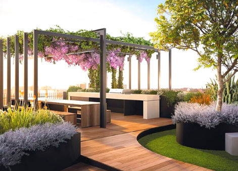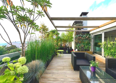 Sân vườn trên sân thượng là nơi thư giãn của các gia đình nên thường được sử dụng sàn gỗ nhằm mang lại cảm giác ấm áp, bố trí những loại cây cảnh đẹp mắt ở vị trí thích hợp để những lúc nghỉ ngơi có thể dễ dàng nhìn ngắm vẻ đẹp của chúng, làm cho tinh thần chúng ta trở nên thoải mái, phấn chấn hơn và có thêm nhiều cảm hứng để tiếp tục thực hiện những điều mà mình yêu thích.