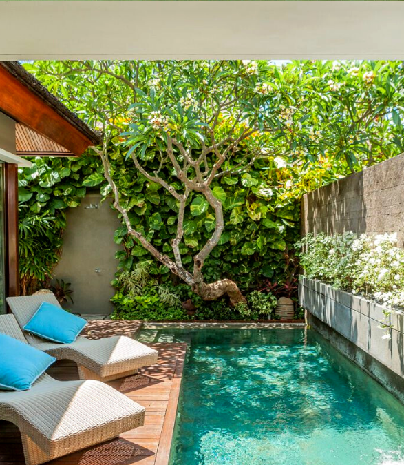 Hồ bơi nhỏ thiết kế ở sau sân nhà ống sẽ là một không gian giúp bạn tránh cái nóng mùa hè tốt nhất. Xung quanh trồng thêm nhiều cây xanh lớn có tán cây rộng che ánh nắng làm mát cho ngôi nhà của bạn. Ngoài ra bạn có thể đặt thêm ở đó vài chiếc ghế để nằm thư giản thưởng thức nguồn không khí trong lành của cây xanh đem lại.