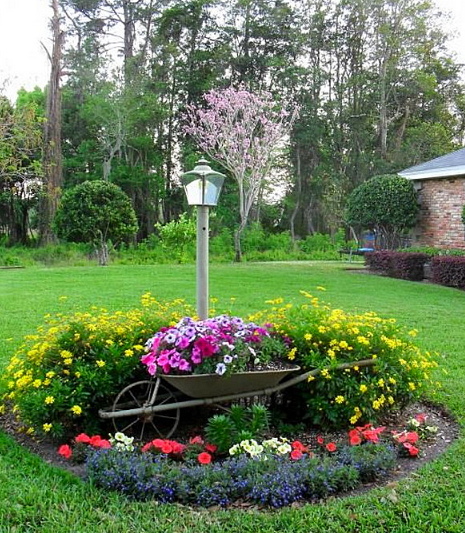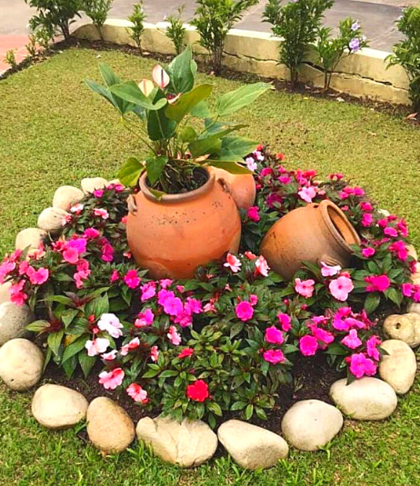 Đặt những bụi hoa, chậu hoa, đá sỏi,… lại gần với nhau mang lại sự đa dạng cho bồn hoa trong sân vườn. Kết hợp với các yếu tố trang trí độc đáo như: xe rùa hay những bình gốm làm nổi bật và nhấn mạnh vẻ ấn tượng, riêng biệt qua đó cảm nhận được phong cách và gu thẩm mỹ của gia chủ.
