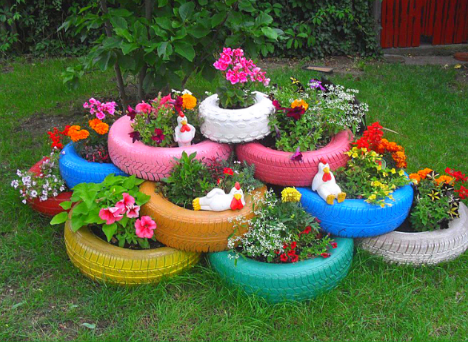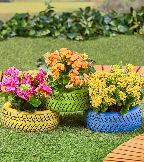 Tận dụng các lốp xe hơi, lốp xe máy phủ màu sắp xếp lại với nhau tạo thành những bồn hoa ấn tượng. Dùng đa dạng các màu sơn để tạo điểm nhấn cho khu vườn. Với thiết kế này bạn sẽ vừa được sở hữu một bồn hoa rực rỡ và vừa thể hiện được phong cách riêng trong chính khu vườn của bạn.