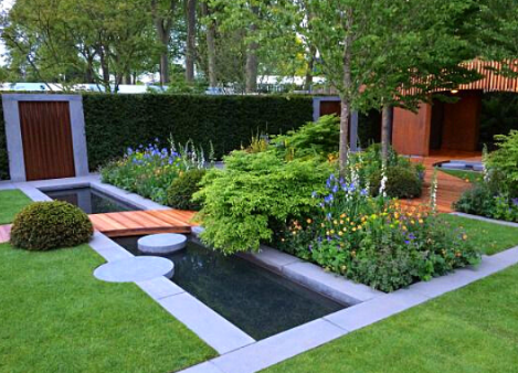 Để tăng thêm vẻ đẹp thơ mộng cho khu vườn, nên sử dụng trang trí một số loại hoa xinh đẹp với nhiều màu sắc rực rỡ khác nhau. Sự xuất hiện của hồ nước trong không gian sân vườn tạo được điểm nhấn hút mắt, đồng thời, mang đến vẻ đẹp sinh động cho ngôi nhà.