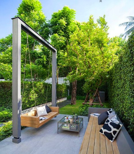 Thiết kế sân vườn với màu xanh của cây, thảm cỏ làm chủ đạo, màu gỗ là nét chấm phá cho không gian sân vườn thêm phần sang trọng. Bố trí ghế ngồi và xích đu để tạo không gian giải trí cho gia đình, con em chúng ta có thể vui chơi và học tập trong môi trường thiên nhiên vô cùng thoải mái, tốt cho sức khỏe.