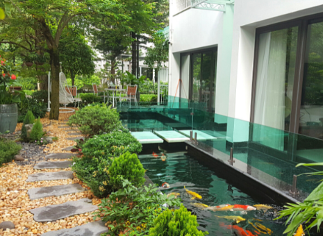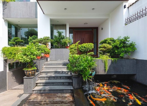 Hồ cá Koi là yếu tố mà hầu như ai cũng sử dụng để trang trí sân vườn. Đặt hồ cá Koi trong sân vườn trước nhà tạo điểm nhấn giúp không gian trở nên sống động và thu hút hơn. Ngoài ra việc ngắm nhìn những chú cá bơi lội dưới hồ cũng là liệu pháp giúp giảm stress và căng thẳng hữu hiệu.