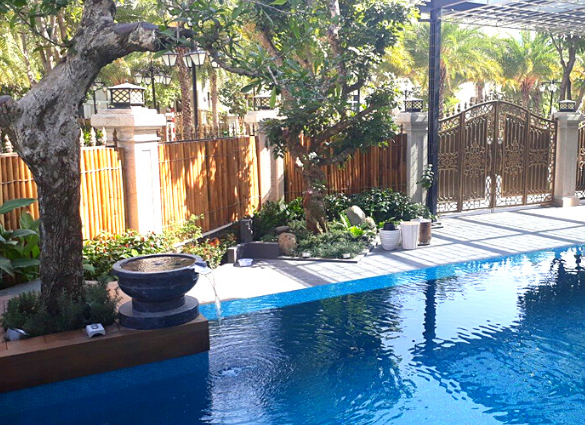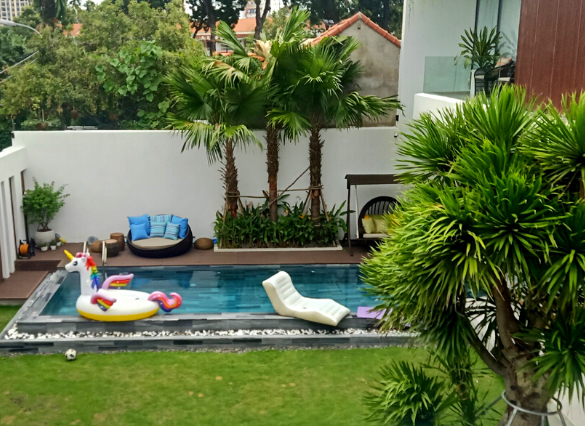 Hồ bơi nằm trong khu vực sân vườn, có kích thước nhỏ, nhưng vừa đủ để sử dụng. Ngoài ra nó đóng vai trò là một phần trong trang trí cảnh quan sân vườn. Mang lại dáng vẻ hiện đại cho ngôi nhà, không khí thoải mái cho gia chủ. Tiếng nước chảy róc rách của tiểu cảnh là tiếng động giúp thư giãn, thoải mái tinh thần cho gia chủ.