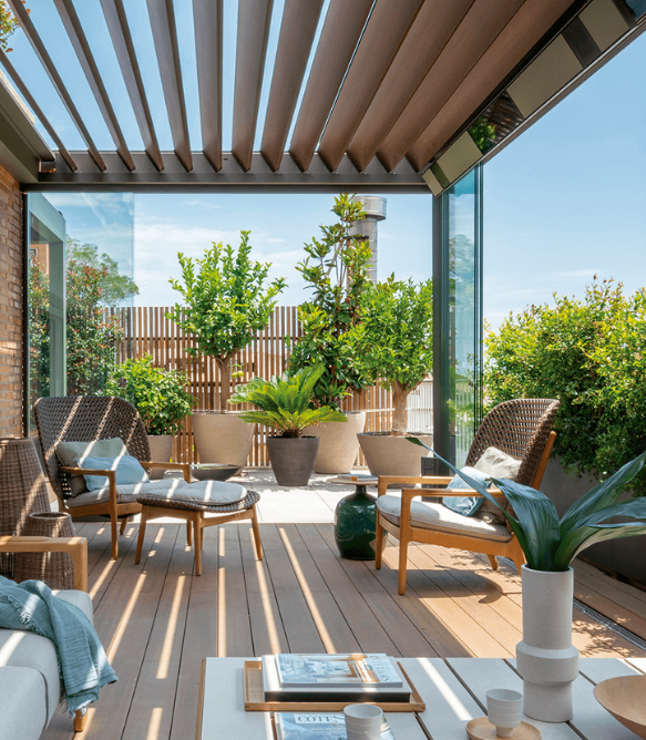 Để có thể nghỉ ngơi, thư giãn, chúng ta rất cần một không gian riêng tư, kín đáo và ít bị tác động bởi môi trường xung quanh. Việc bố trí cây xanh bao phủ xung quanh khu vực sân thượng, sẽ góp phần giảm thiểu tiếng ồn và tạo nên không gian riêng tư để gia đình bạn có thể trò chuyện hoặc tiếp khách.