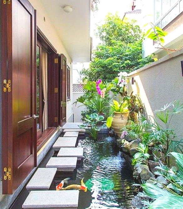 Hồ cá kết hợp với tiểu cảnh dòng nước chảy và cây xanh mang đến một cảnh quan sân vườn sống động, âm thanh của dòng chảy như một liều thuốc hữu hiệu giúp giảm stress, áp lực, căng thẳng. Sau một ngày làm việc vất vả trở về, khi ngắm nhìn các chú cá Koi bơi lội tung tăng dưới hồ, nó sẽ khiến cho mọi mệt mỏi, lo toan dường như tan biến.