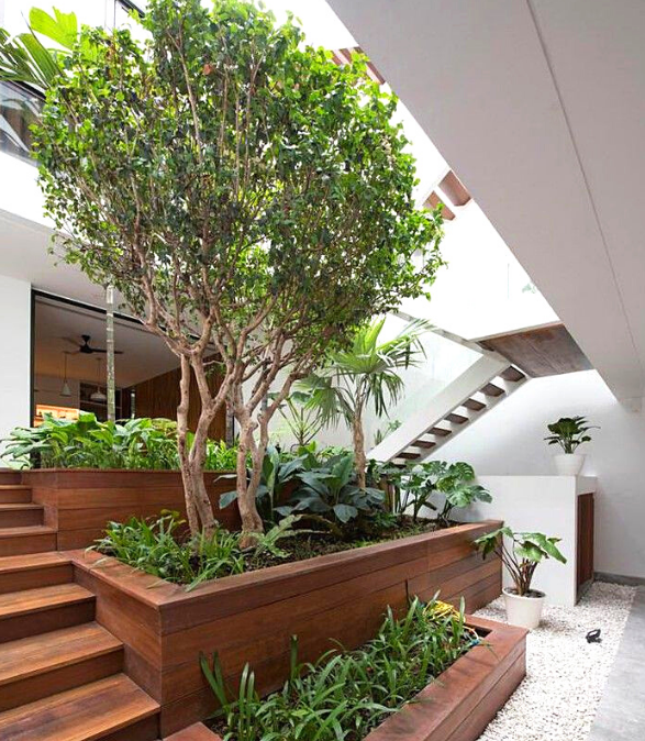 Ít ai nghĩ đến việc thiết kế các bồn cây xanh ở khu vực giếng trời. Nếu bạn thiết kế sẽ là một cái gì đó đặc biệt cho ngôi nhà. Các cây xanh tràn đầy sức sống sẽ làm cho tinh thần thư giãn thoải mái, không khí trong lành sẽ giúp tăng tuổi thọ, lâu già.