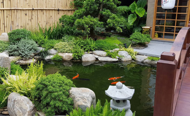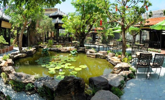 Thiết kế hồ cá giữa vườn tạo không gian rộng rãi thoáng mát cho quán cafe