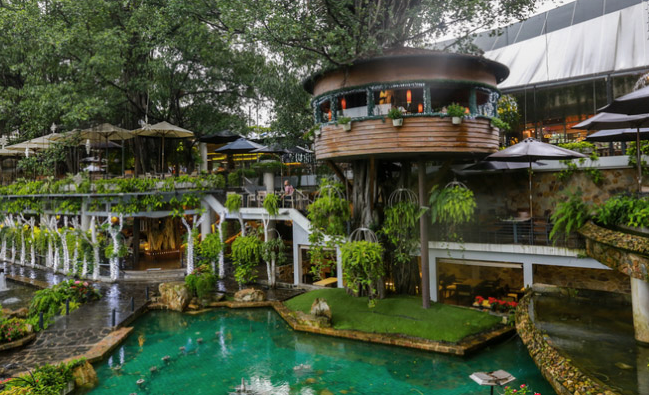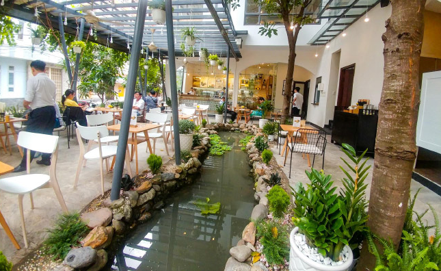 Cafe với hồ cá kết hợp với mảng xanh tạo nên không gian mát mẽ