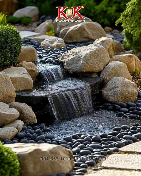 - Cây xanh, thác nước nhỏ, tiểu cảnh đá để tạo không gian tự nhiên mềm mại